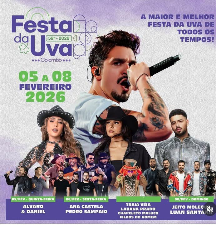 A tradicional Festa da Uva de Colombo chega à sua 59ª edição em 2026 com a promessa de ser a maior e melhor de todos os tempos. O evento acontece entre os dias 5 e 8 de fevereiro, reunindo cultura, música e celebração da identidade local em uma programação intensa voltada para toda a família.