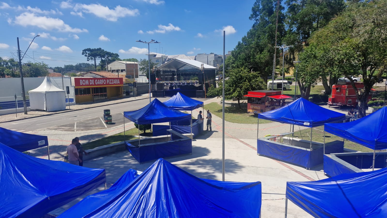 A estrutura para o primeiro Carnaval aberto ao público de Campina Grande do Sul já começa a tomar forma na região central do município. A montagem do palco onde a Banda Bora Rolê se apresentará, além das barracas que irão abrigar a feira de artesanato, produtos rurais e gastronomia, já começam a tomar forma na Praça Bento Munhoz da Rocha, na Sede.