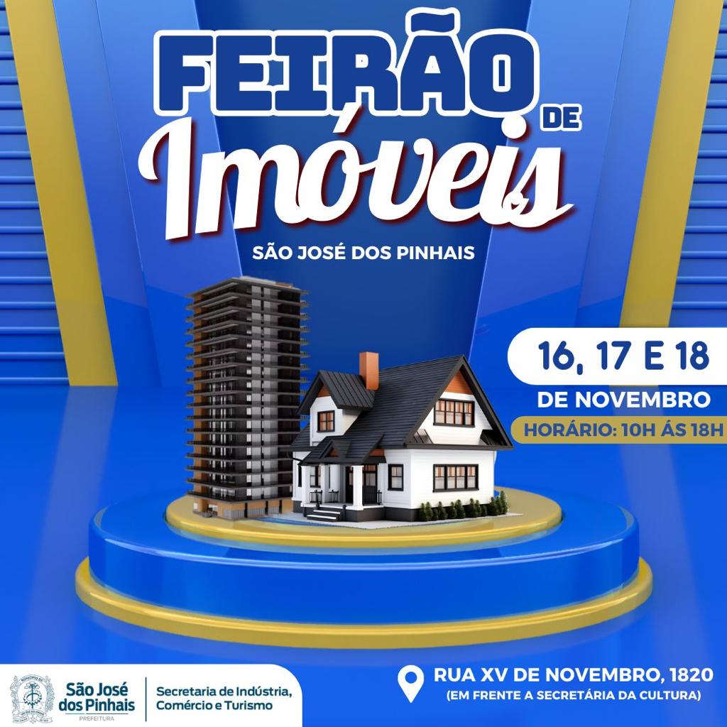 A Prefeitura de São José dos Pinhais, por meio da Secretaria de Indústria, Comércio e Turismo (Sictur), promoverá o Feirão de Imóveis nos dias 16, 17 e 18 de novembro, em frente à Secretaria de Cultura (Rua XV de Novembro, nº 1820). O evento, de acesso gratuito, atenderá os interessados das 10h às 18h.